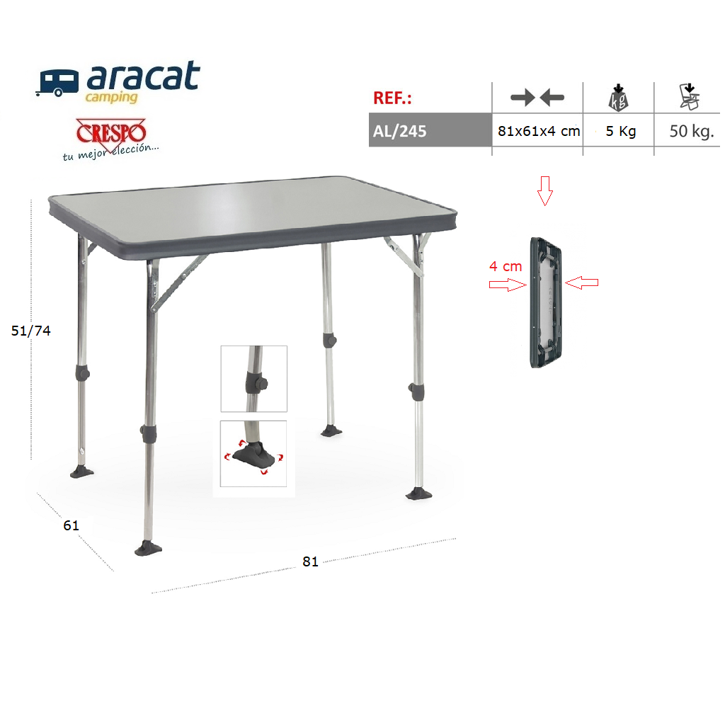 Mesa Crespo AL/245 muy ligera y estable con plegado super plano en tan sólo 4 cm. Tablero gris resistente a altas temperaturas, arañazos y humedad.